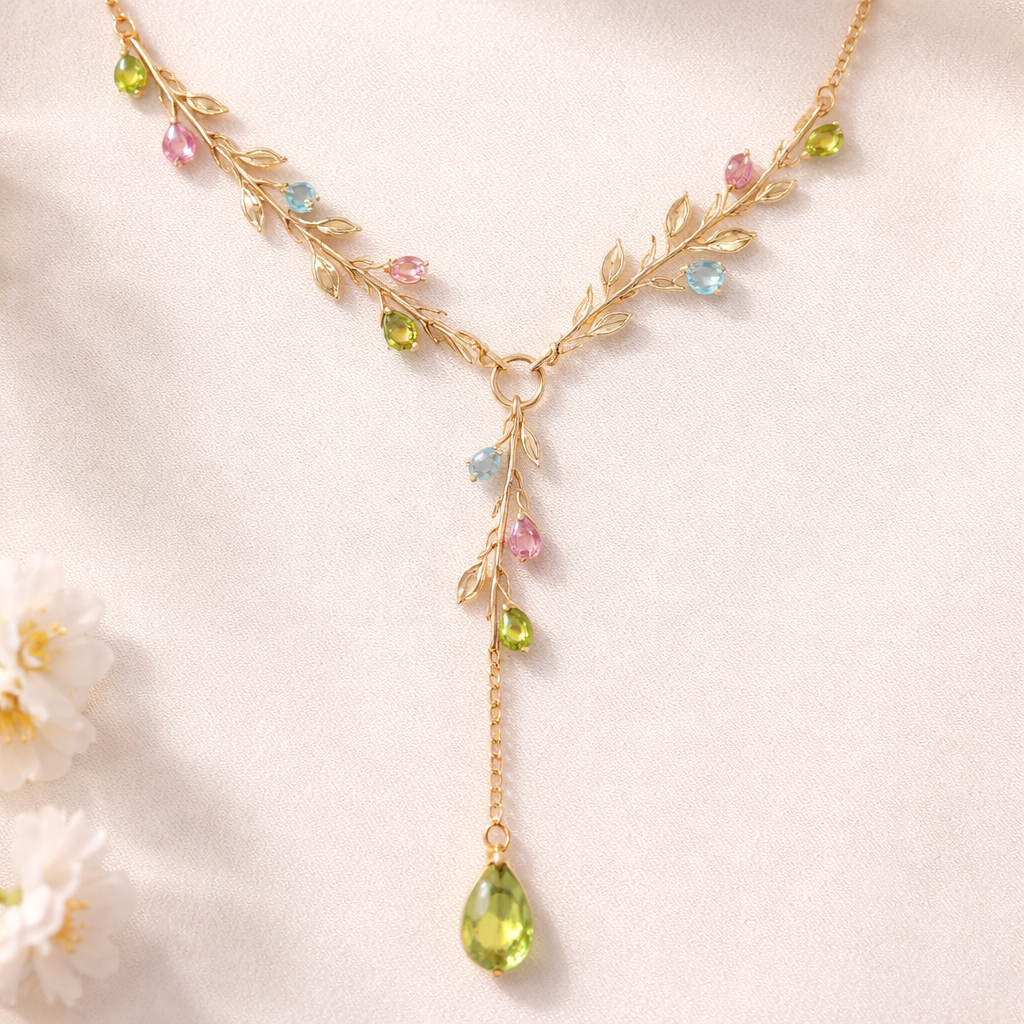 Thin Gold chain with thin wire wrapped around it like an olive branch and small pear cut bright peridot, pink and light blue sapphire stones placed throughout the chain with a lariat.