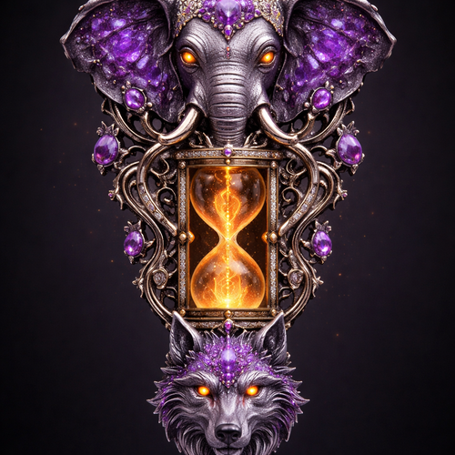Elephant head and wolf head that dangles with purple pearls crushed into the fir and skin. Add a hour glass time clock ...