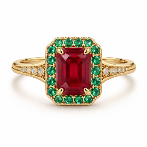 A classic women's ring made of gold with ruby and emerald stones. the ruby is a 8x6mm emerald cut, emeralds are 2mm roun...