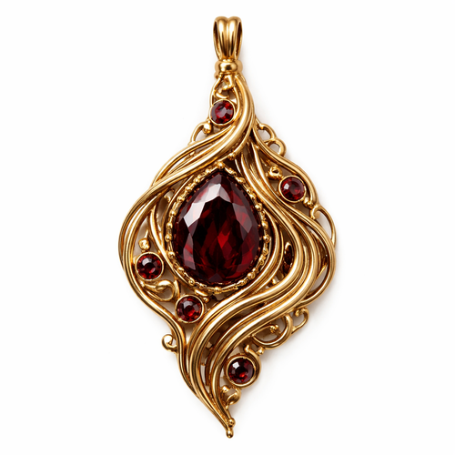 Golden waving wiring pendant with dark red stonework