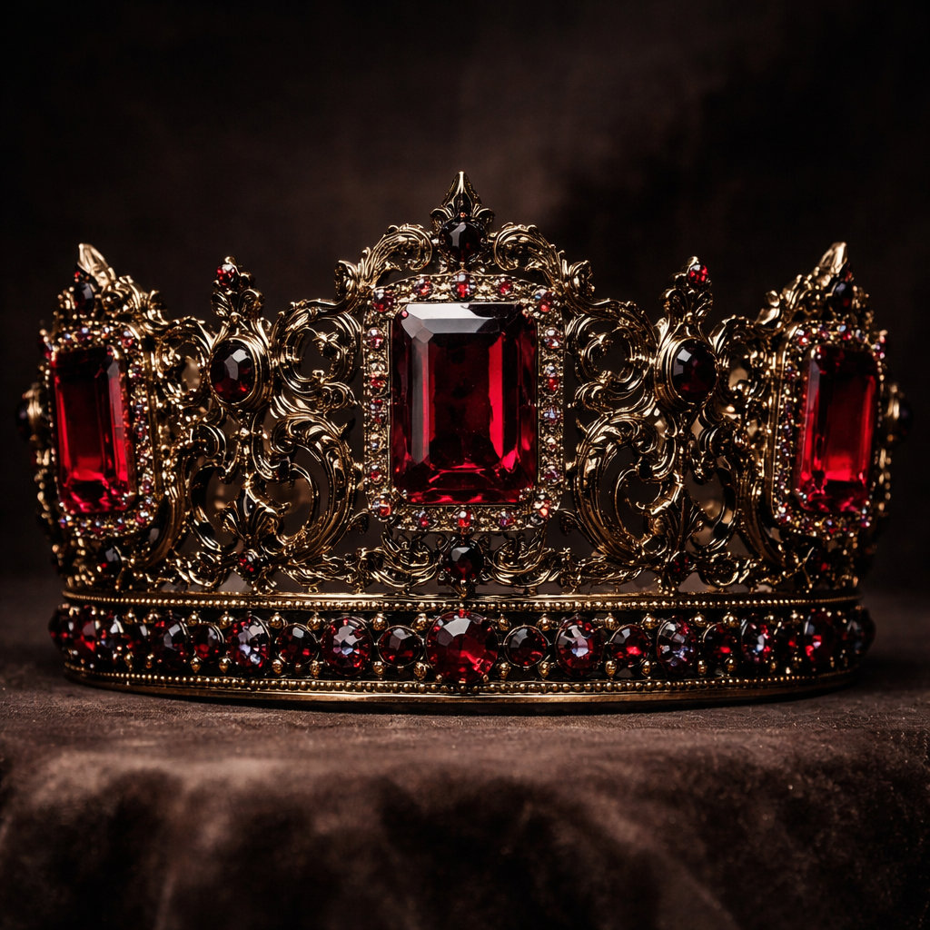A dark gold crown with 3 dark red rectangular diamonds and even more dark red diamonds surrounding it with golden carvings and black diamonds , royal style