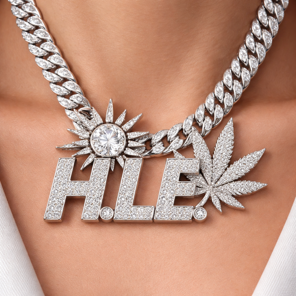 A modern women's necklace made of silver with diamond stones. H.L.E for the pendant unique design with a Cuban link with a sun and weed plant slanted to the right side plant in the back