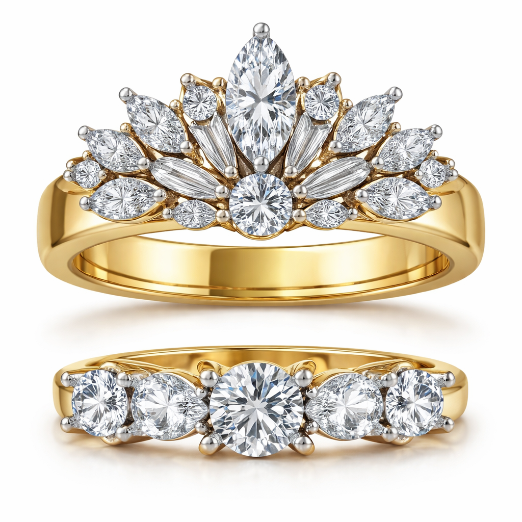 .6 karat marquise centered, with .25 round directly under it with 6 more smaller marquise diamonds and 2 .15 round diamonds mounted on a wide 14k yellow gold band. Make the design in a fan shape and use platinum prongs add some baguette diamonds also this is the exact size of the 6 smaller marquise stones and the baguette stones pair this ring with a five stone anniversary ring with platinum prongs in 14 karat gold band diamonds .2 karat Center round cut Diamond measures 4mm +- 0.25ct 2 x +- 5mm x 2.5mm marquise diamonds +- 0.13ct each 1 x +-4.5mm x 2.5mm marquise diamond +- 0.11ct 1 x +-3.5mm x 2mm +- 0.07ct 2 x +- 4mm x 2mm +- 0.10ct each 8 x +- 2mm x 1.5mm +- 0.02ct each