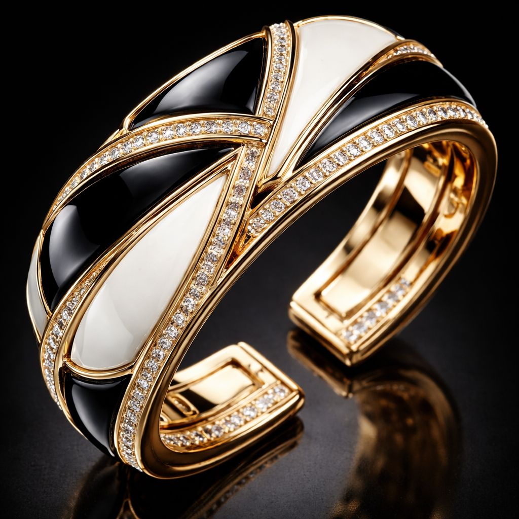 A highly detailed high-end luxury jewelry design, crafted in 18k yellow gold, featuring elegant black and white enamel detailing. The design is sophisticated and modern with a touch of timeless luxury, including smooth enamel surfaces contrasted with polished gold edges. Subtle diamond accents embedded along the structure for extra brilliance. Refined craftsmanship, clean lines, balanced composition, inspired by haute couture jewelry houses. Ultra realistic, 8K resolution, macro shot, studio lighting, soft shadows, reflective surface, black background, luxury product photography, extremely detailed textures., luxury style