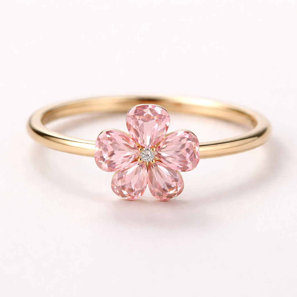 A ring with a flower shaped pink gem in the middle , minimalist style