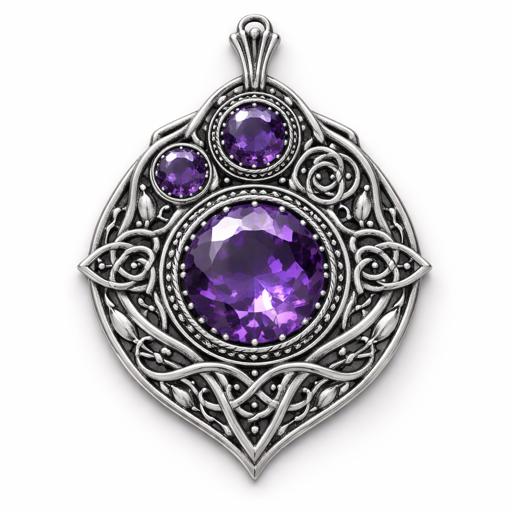 Three round amethyst gems, two small and one larger gemstones in a silver pendant, celtic style