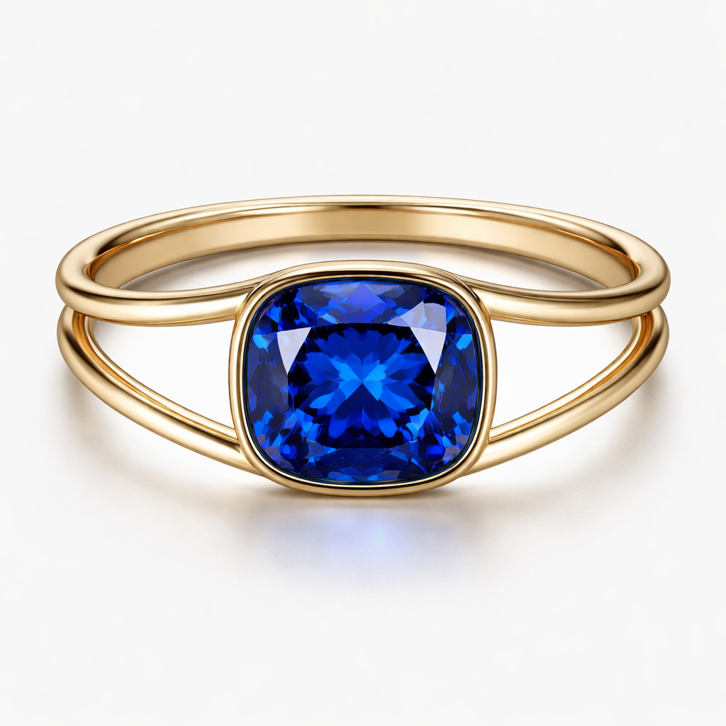 Sapphire 3,28 carat royal blue cushion. Need ring without any additional stones but something not classic. Yellow gold. Not too much gold. Stone between two lines of gold and thin gold around the stone like a stone inside gold