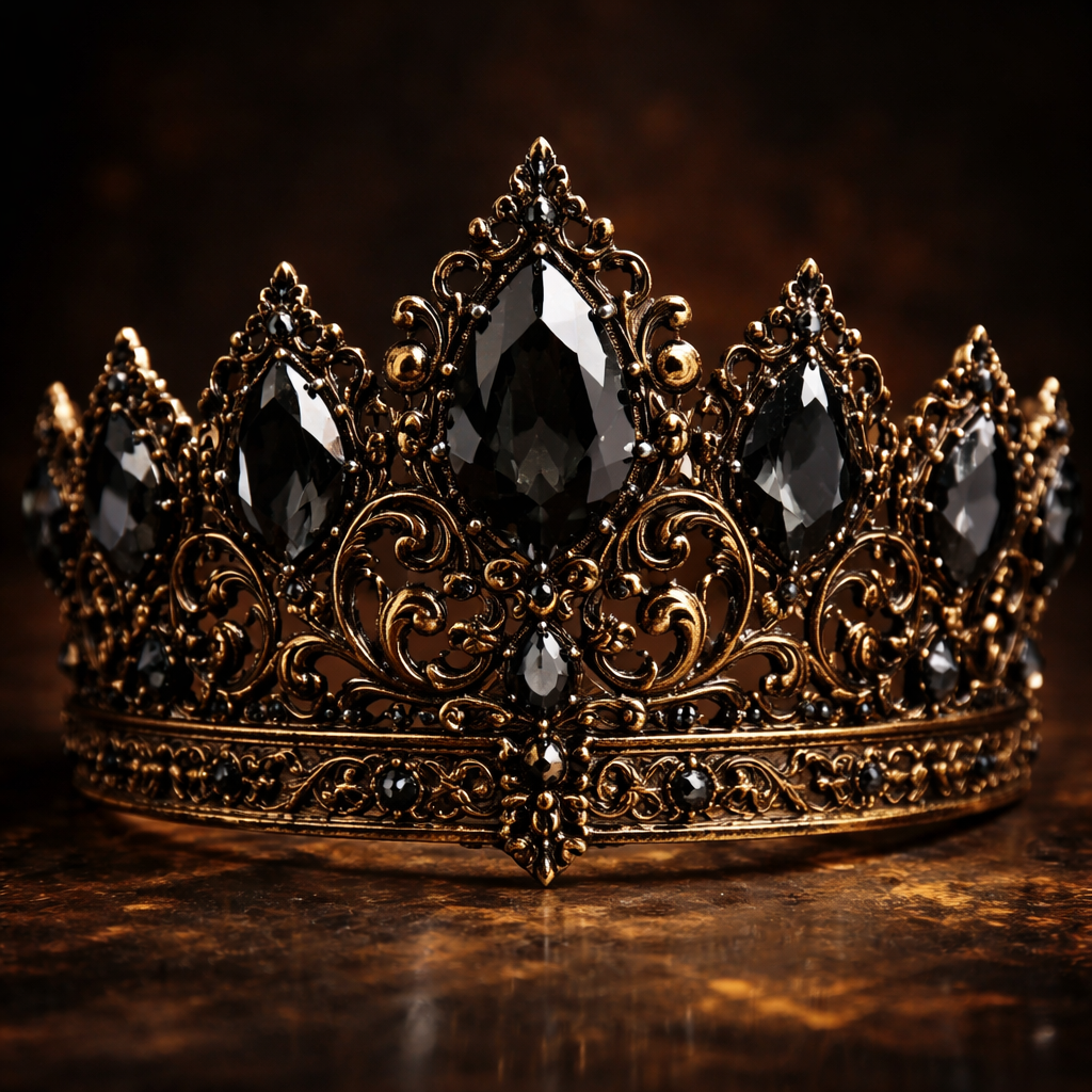 A crown with a row black diamond with dark rich gold carvings and smaller black diamonds to add extra detail to the crown , romantic style