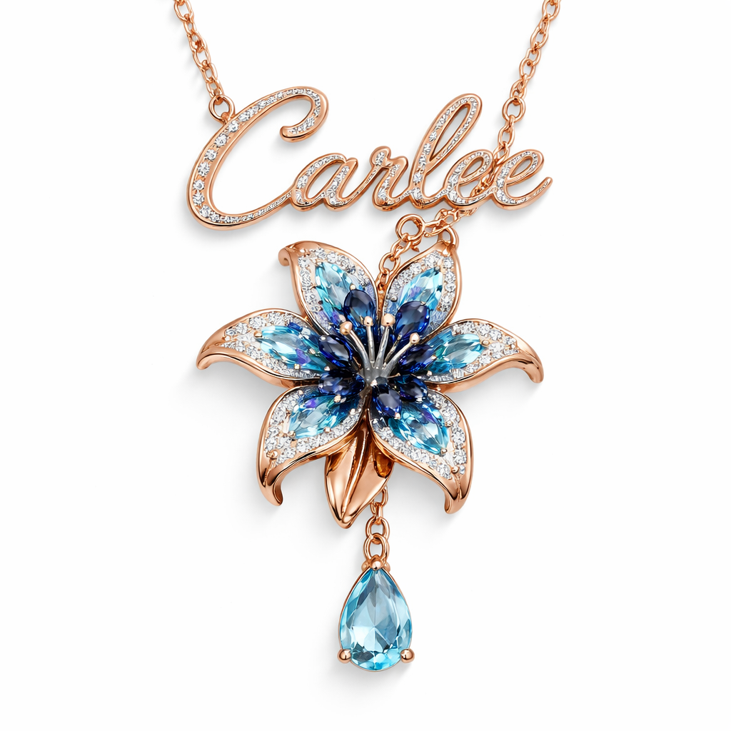 A modern women's necklace made of rose gold with sapphire and topaz stones. I want a pendant Lilly flower on the bottom and on top the Name Carlee