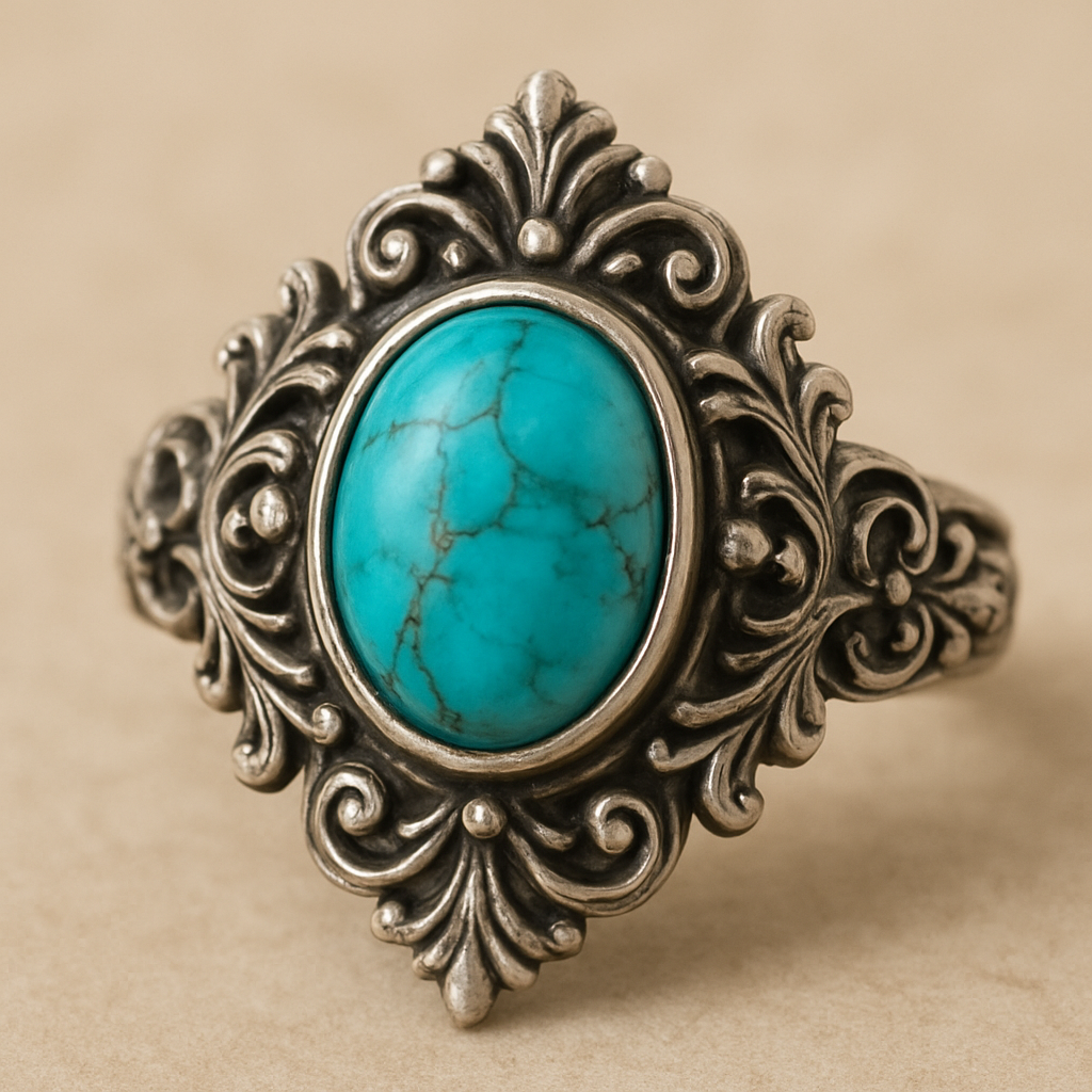 Diamond ring with a smooth heart-shaped stone. The ring is round and features small diamonds.