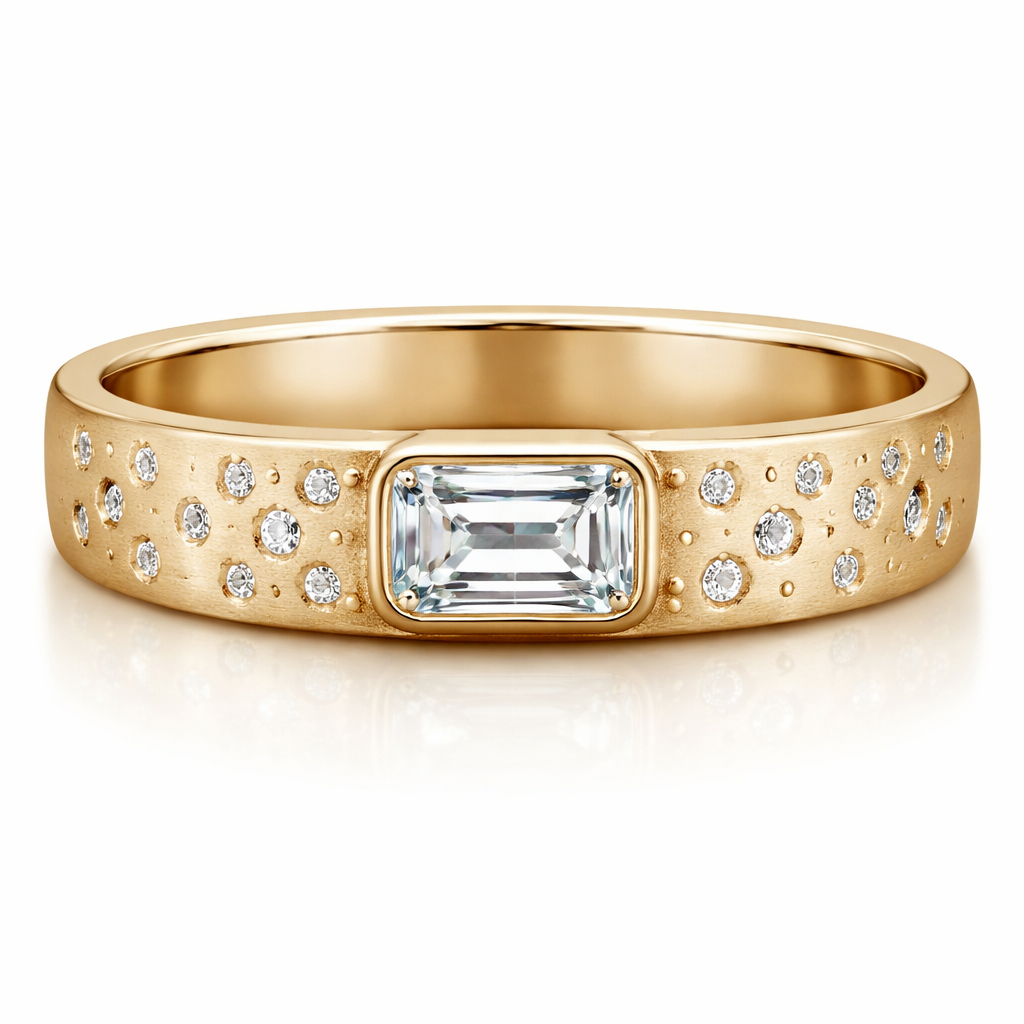 Thick gold band with one carat emerald cut diamond set horizontally with 20 small round diamonds scattered