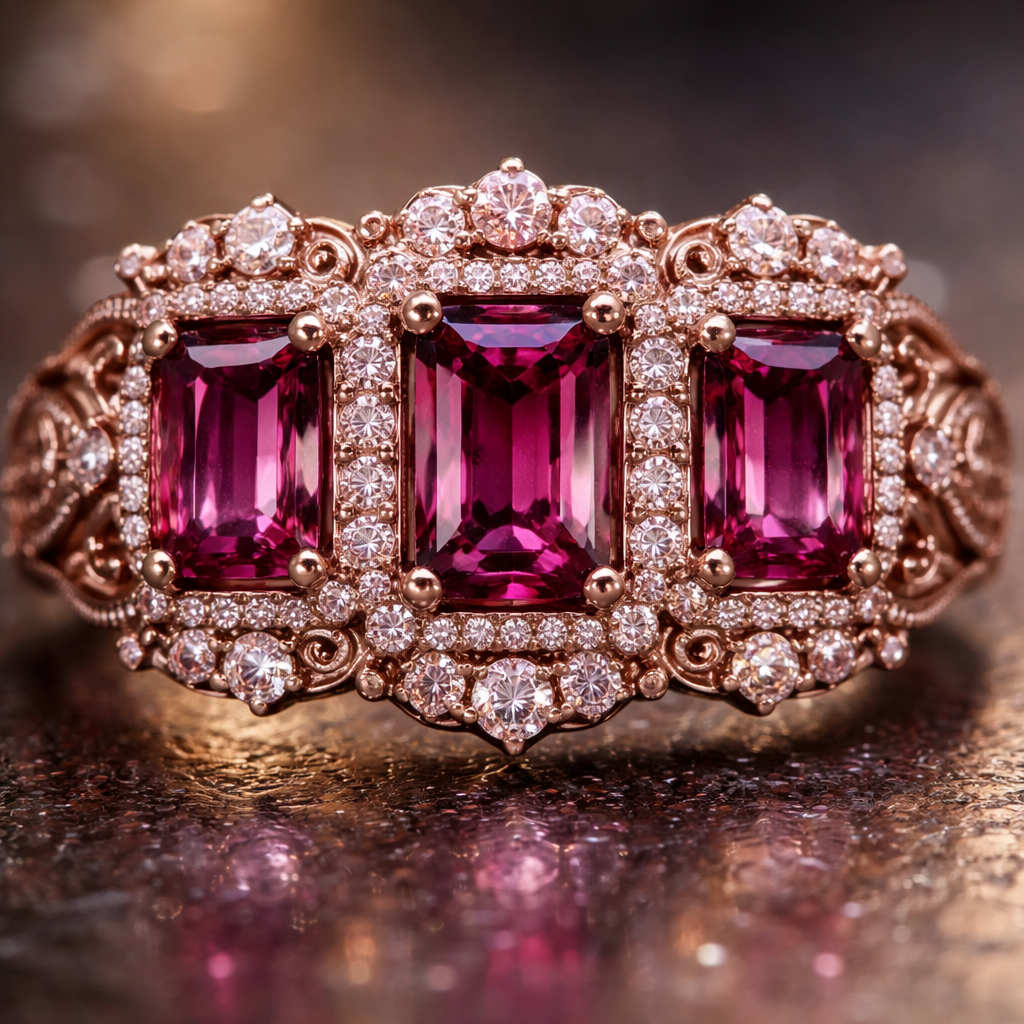 A ring with three dark rich rose pink rectangle gems with dark baby pink gems surrounding it and even more diamonds surrounding those with dark rose gold carvings