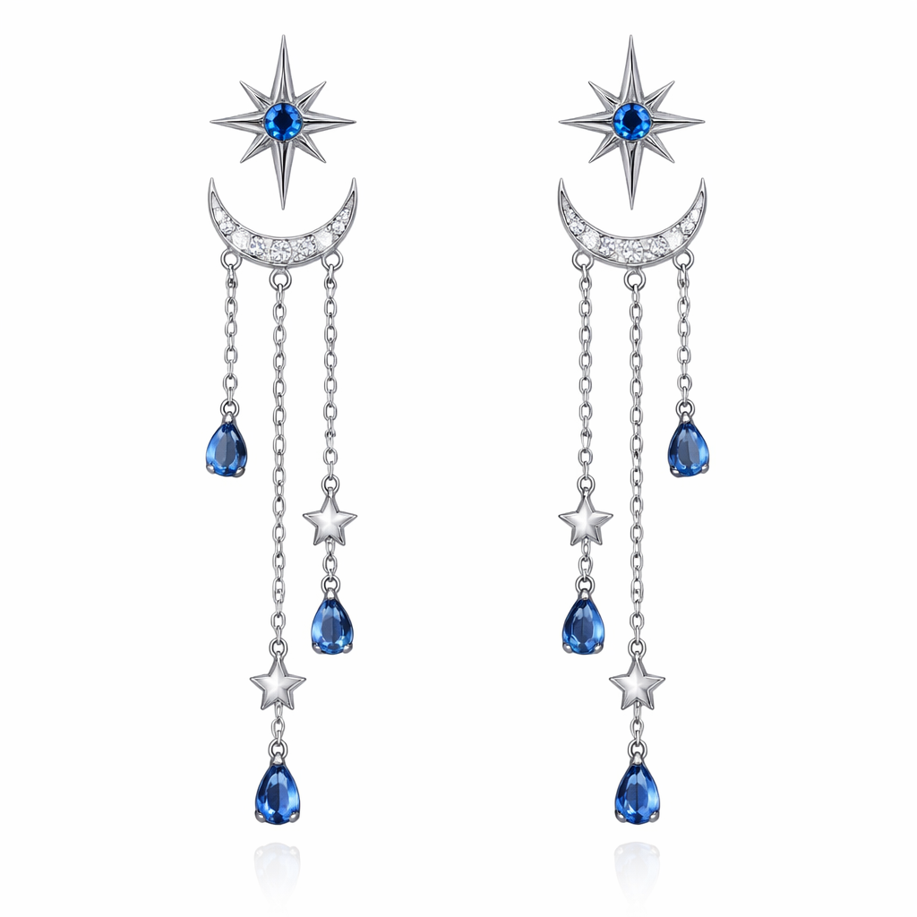 A minimalist women's earrings made of silver with sapphire stones. brinco com uma estrela de 8 pontas central e uma meia lua embaixo. três correntes são ligadas a estrela principal com estrelas e pedras azuis penduradas, minimalist style