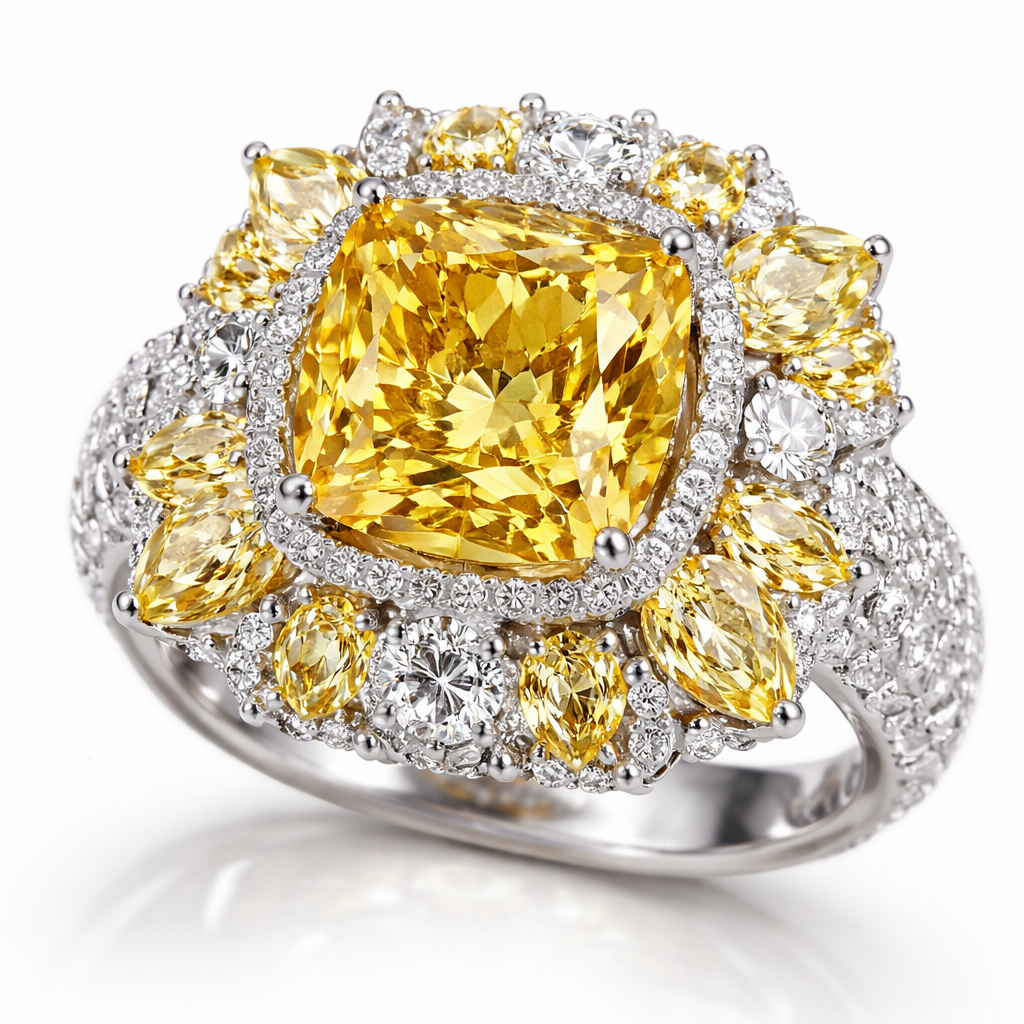 A ring with a rich deep baby yellow pillow shaped gem with tons of diamonds surrounding it and other small baby yellow gem carvings, gemstone style