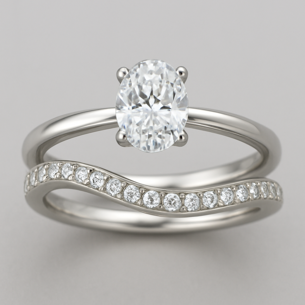 Platinum solitaire ring with a 1.50ct oval diamond in a prong setting, soldered to a curved platinum wedding band with 25 x 1mm round diamonds in a claw setting.