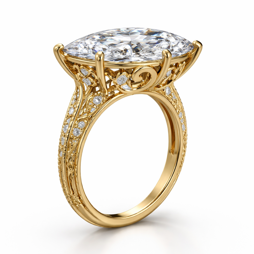 4 carat solitaire marquis cut, yellow gold, high setting, show a side view , vintage style