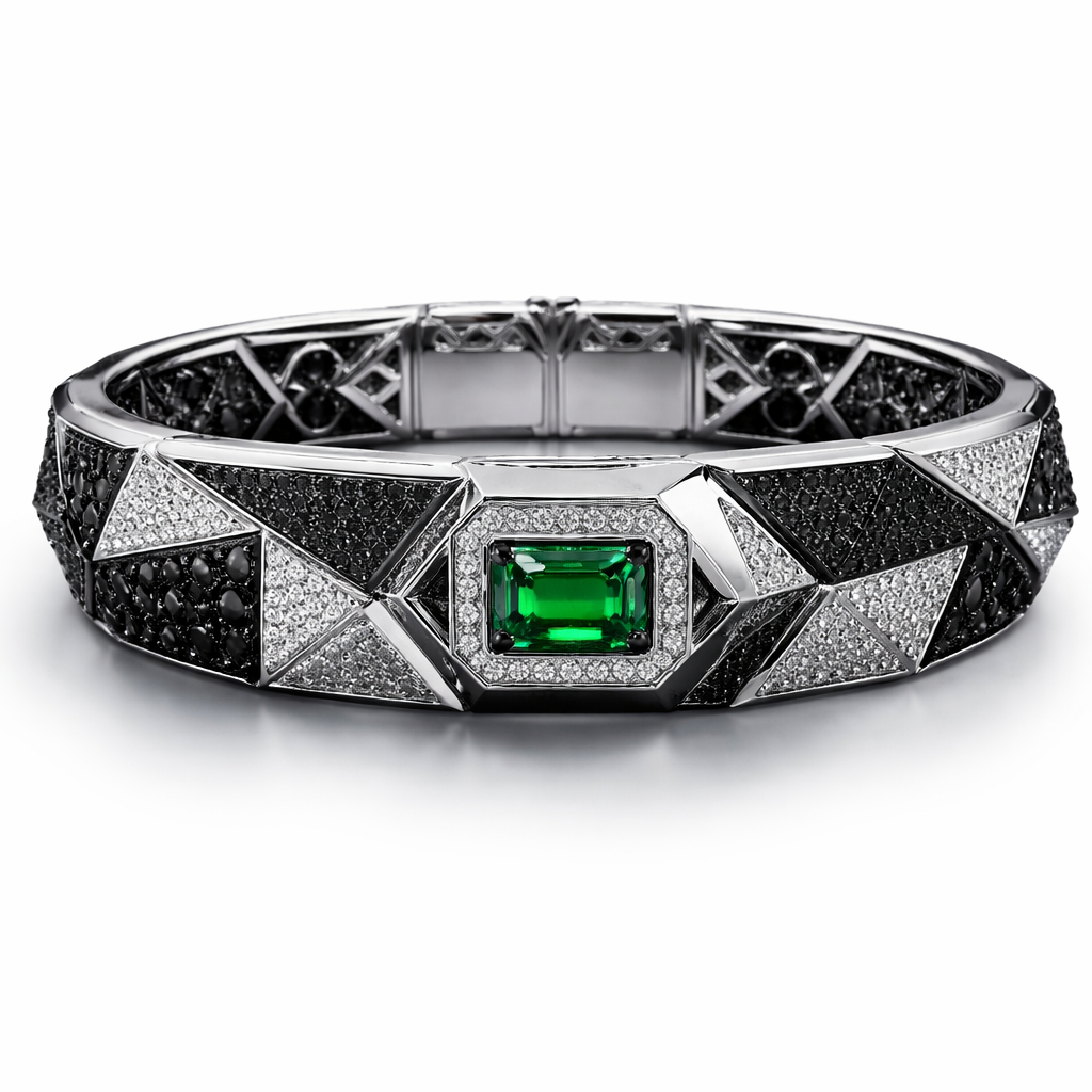 Geomatric pyramid sharp angles edgy angles bangle for men of rectangular and sqaure shape of white and blcak diamonds of unique design and special shape and green eye