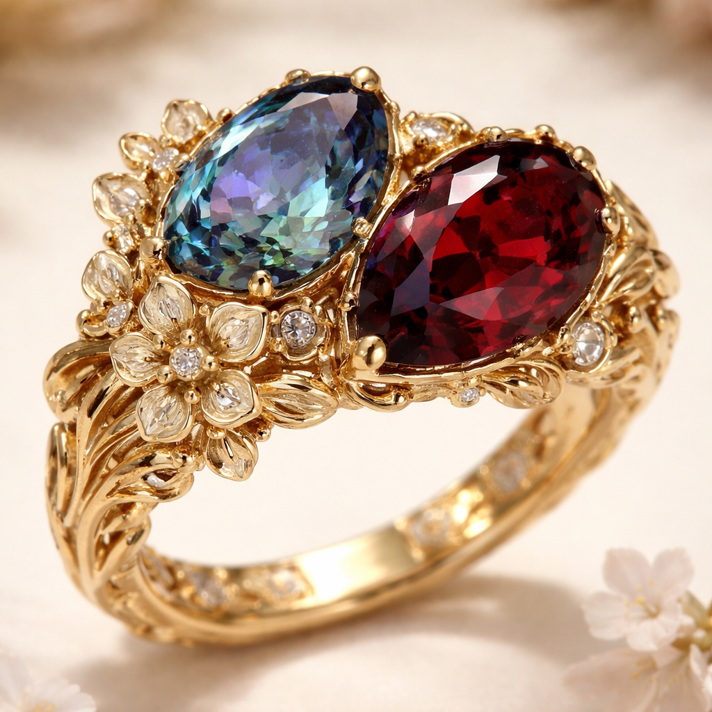 Toi et moi ring alexandrite and garnet gold floral design
