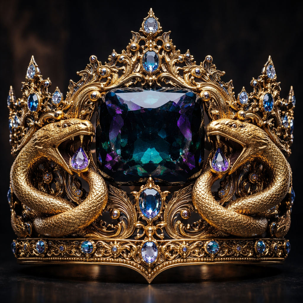 A giant crown with an extremely dark Alexandrite pillow shaped gem with deep rich golden snake carvings with its mouth open with an Alexandrite gem in its mouth. More smaller alexandrite gems are also put on the crown with lots of architectural details and not to mention, there will be to golden carved snakes, not 1,