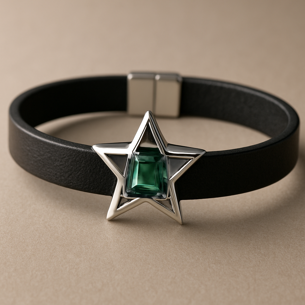 Armband 1 cm breit schwarzes Leder in Silber eingearbeitet in Form eines Stern glänzend mit grünem Diamant in Trapezform, luxury style