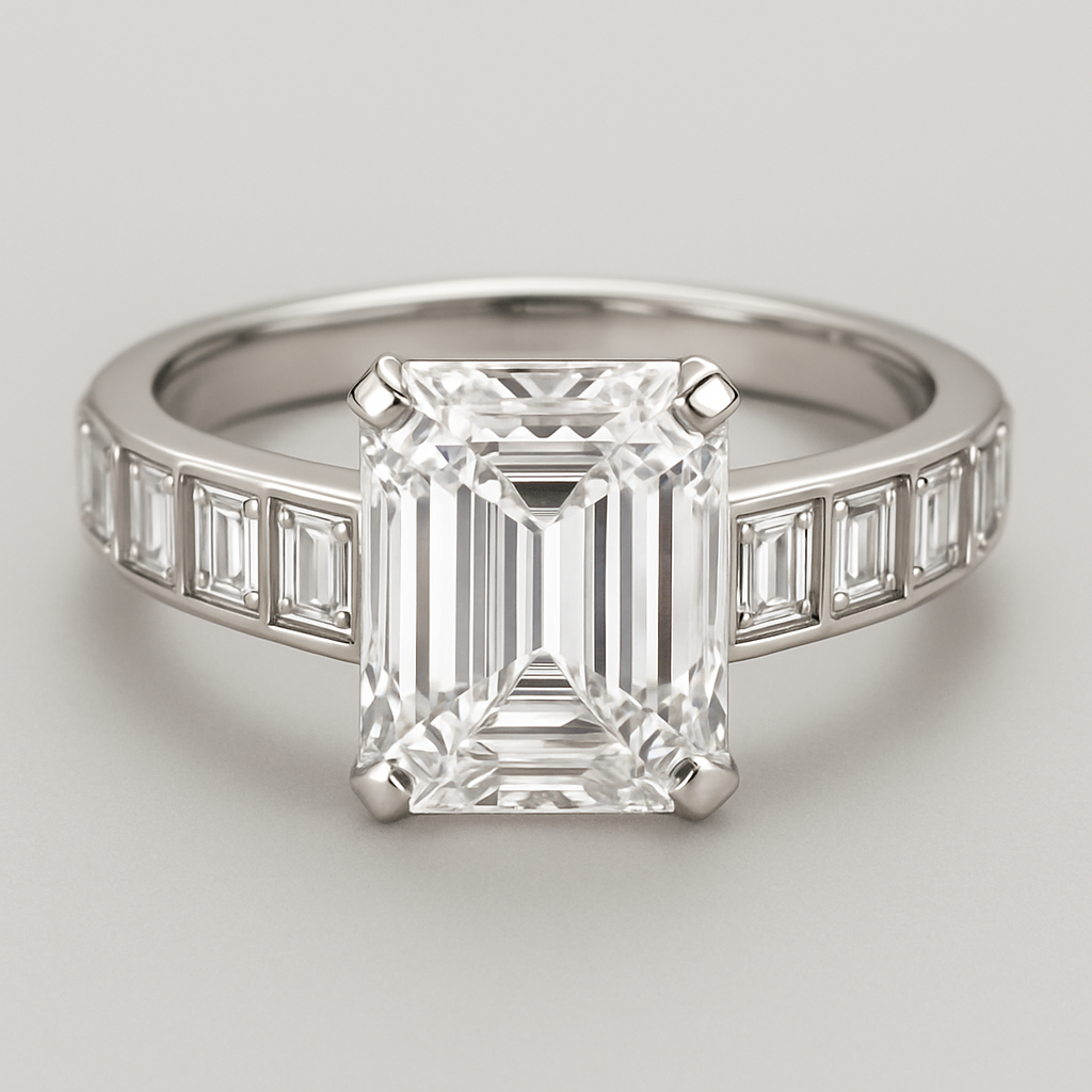 White gold prong set 5ct emerald cut diamond ring with bezel set baguettes around the band