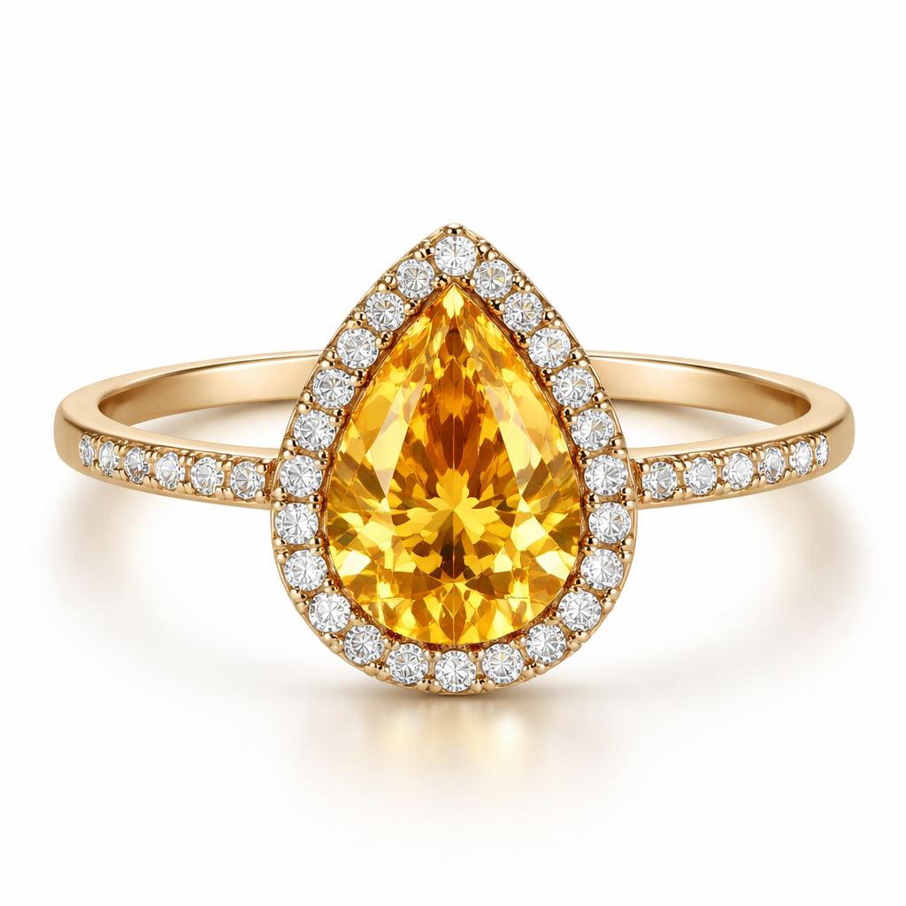 A ring with a rich vintage yellow teardrop shaped gem with tons of diamonds surrounding it with gold , minimalist style