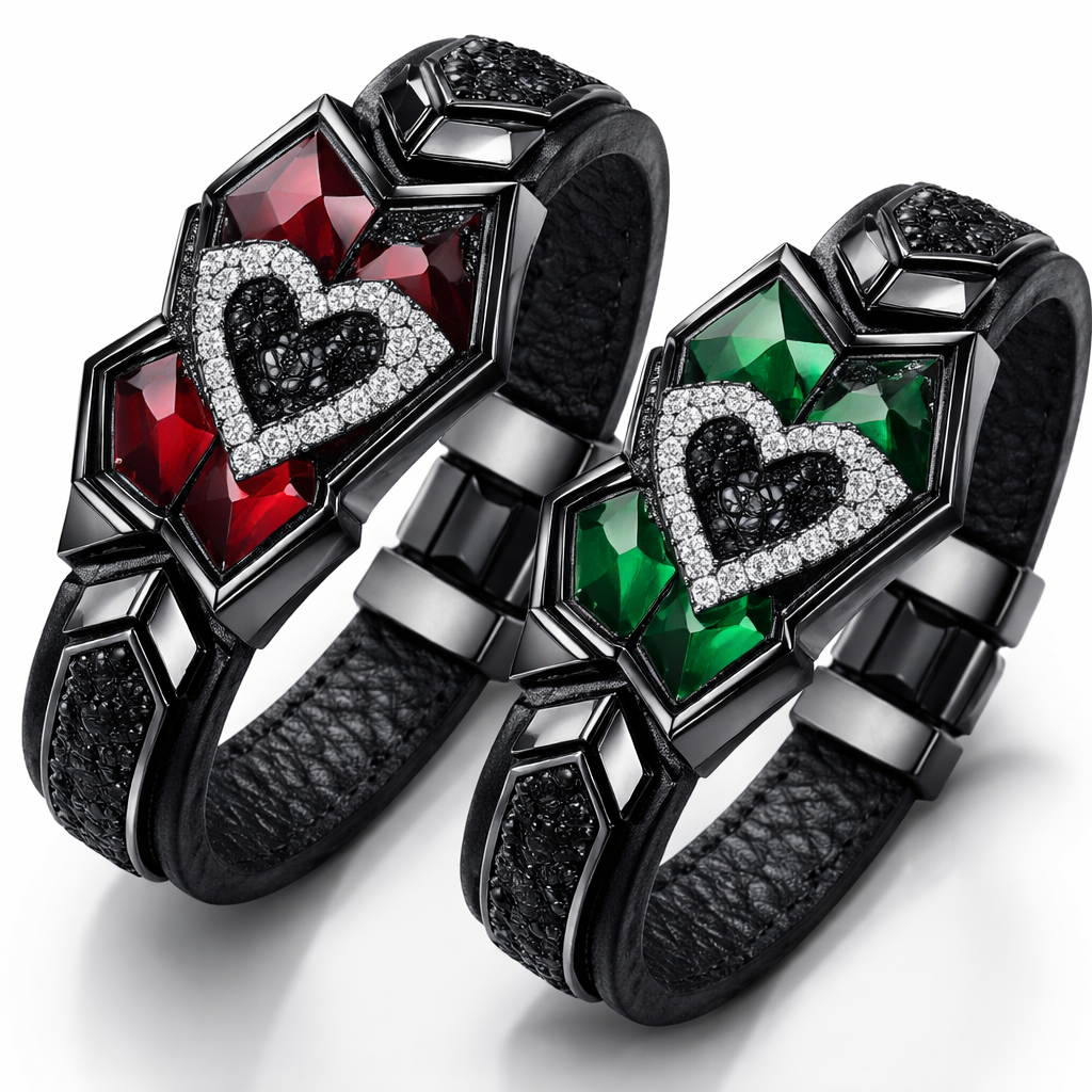 Geomatric leather bangel red and green of heart of geomatric shape and bold style and edgey for matching couples of white background of gd with black and white diamond