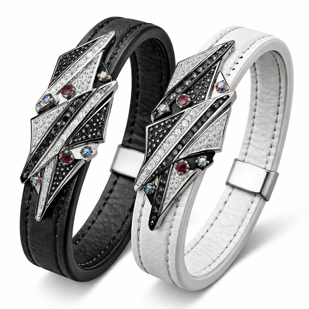Geomatric abstract shape of bangle leather of matching for couple white and black diamonds and smal stones of ruby of edgy style white background