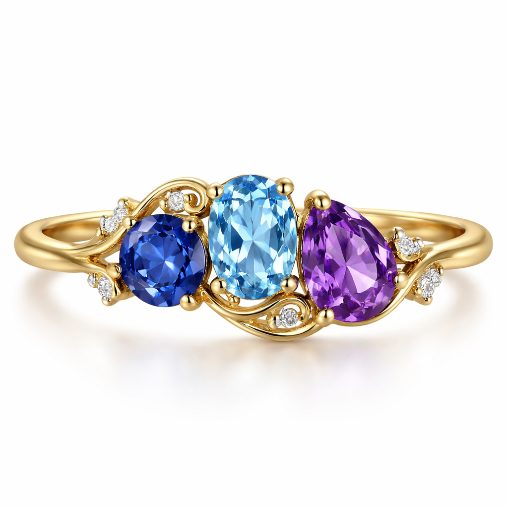 Design a three stone asymmetrical design with a .25 sapphire, a blue topaz and an amethyst… Make these stones similar in size but different shapes. Do not put diamonds onto the band. add diamonds sprinkled throughout with a 2mm yellow gold band , art_nouveau style