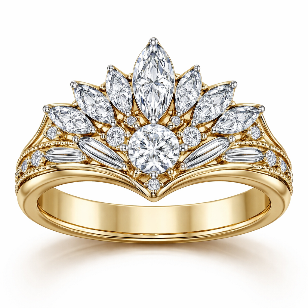 .6 karat marquise centered, with .25 round directly under it with 6 more smaller marquise diamonds and 2 .15 round diamonds mounted on a wide 14k yellow gold band. Make the design in a fan shape and use platinum prongs add some baguette diamonds also this is the exact size of the 6 smaller marquise stones and the baguette stones Center round cut Diamond measures 4mm +- 0.25ct 2 x +- 5mm x 2.5mm marquise diamonds +- 0.13ct each 1 x +-4.5mm x 2.5mm marquise diamond +- 0.11ct 1 x +-3.5mm x 2mm +- 0.07ct 2 x +- 4mm x 2mm +- 0.10ct each 8 x +- 2mm x 1.5mm +- 0.02ct each, art_nouveau style