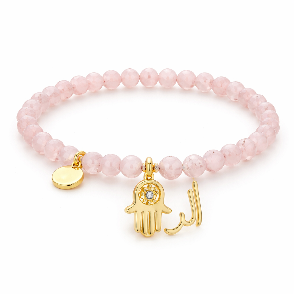 A bracelet made of natural rose quartz stone beads (3 mm), strung on elastic for a comfortable fit. It features a plain gold pendant and an Arabic word charm hanging from a palm-shaped element. The Arabic word is: أل ر. , modern style