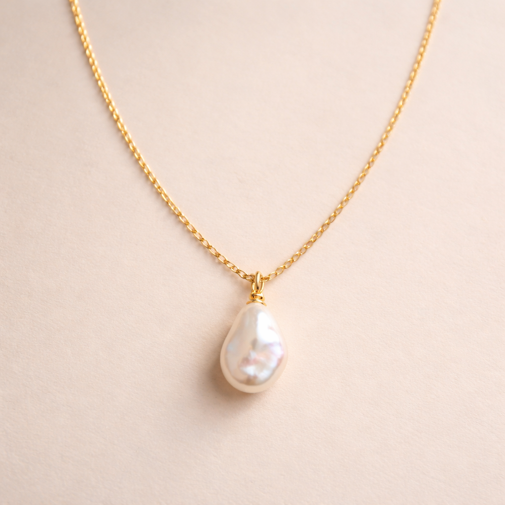Gold necklace with one irregular shaped pearl, minimalist style