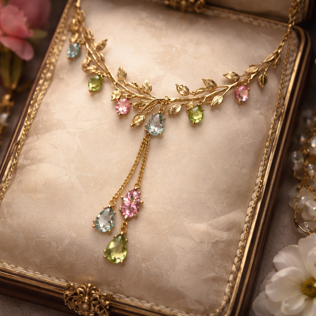 Thin Gold chain with thin wire wrapped around it like an olive branch and small pear cut bright peridot, pink and light blue sapphire stones placed throughout the chain with a lariat. , georgian style