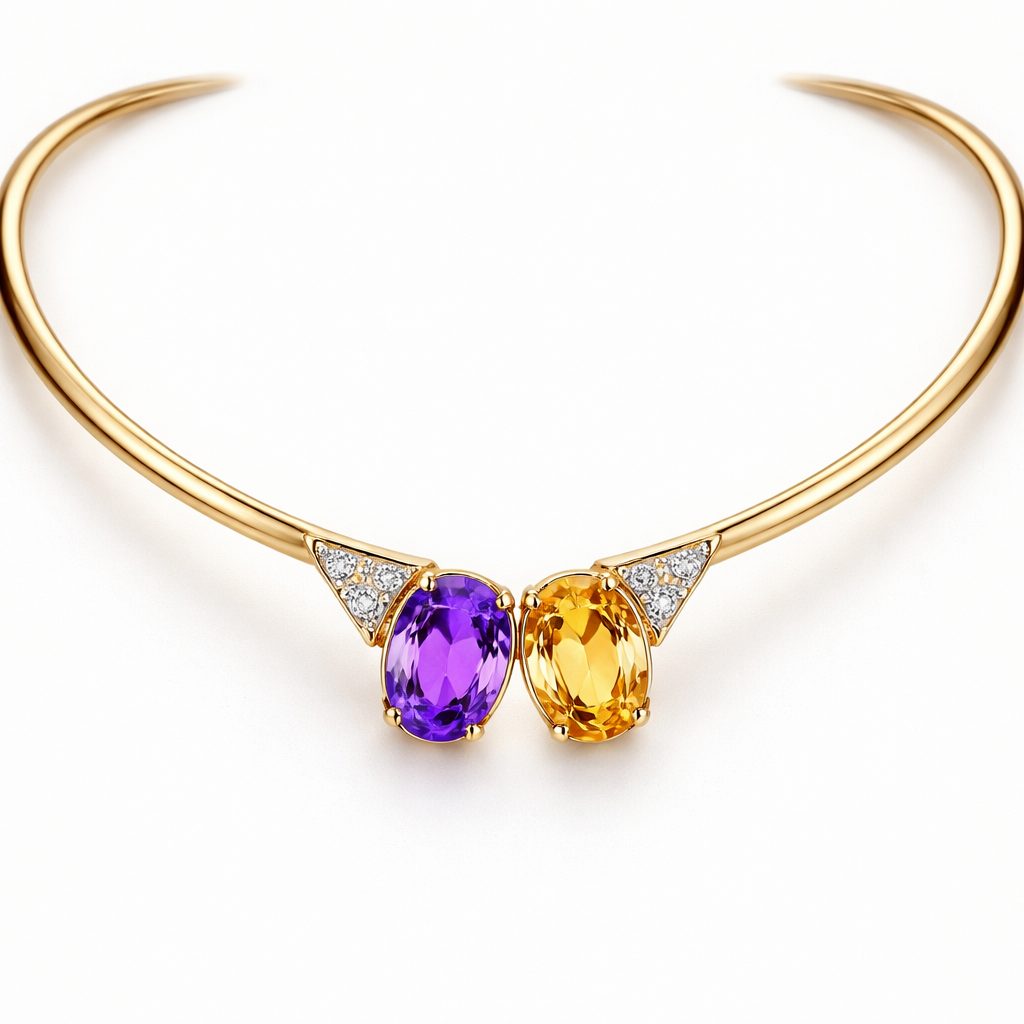 Gold choker with two middle size oval stones at the middle from end . One violet one yellow. As attachment from the c choker to the stone a triangle with three little diamonds , modern style