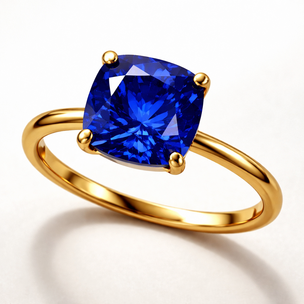 4 carat cushion sapphire royal blue ring in any design in yellow gold only and with no additional diamonds, something s...