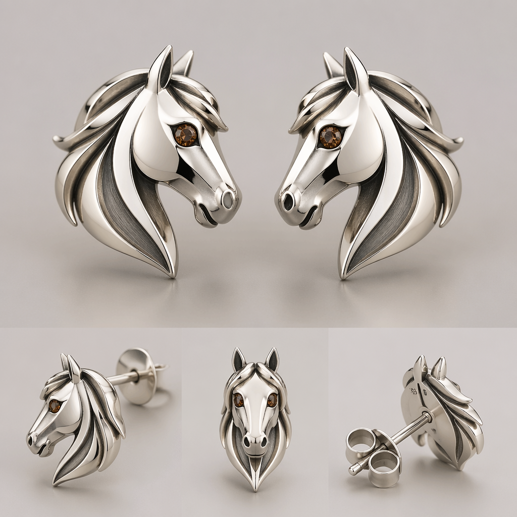 Horse head with mane earrings studs brown stone eyes, modern style