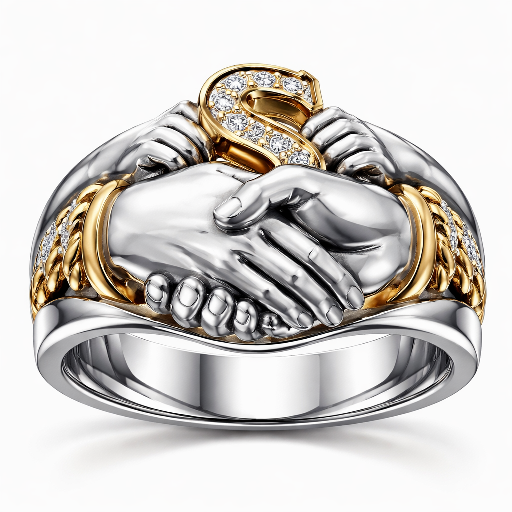 A women's ring. Anillo para hombre con dos manos agarradas y 2 manos pequeñas sujetando los dedos de la mano y una S al fondo, modern style