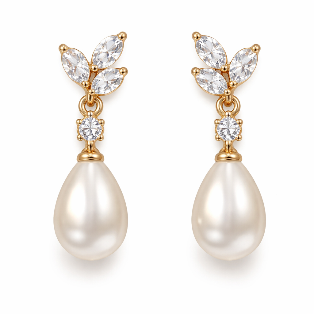 Short Gold Pearl drop earrings with white sapphires as leaves, everyday style