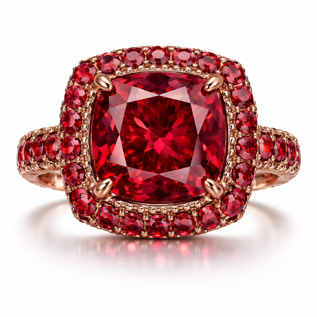 A ring with a pillow shaped red diamond with red diamonds surrounding it, gemstone style
