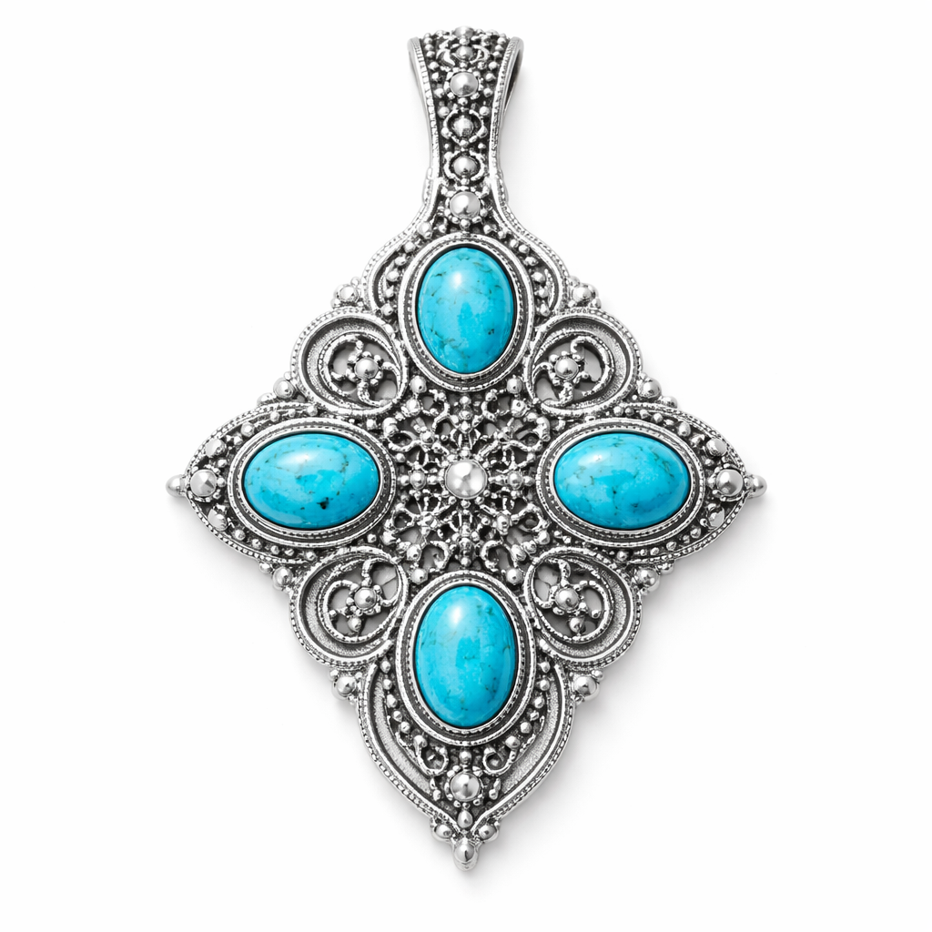 Four 6x4 calibrated oval turquoise cabochons set in silver pendant, filigree style