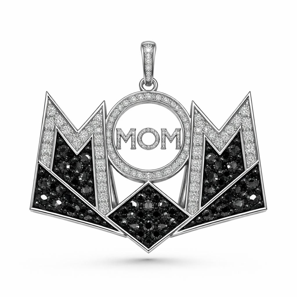 Geomatric architecture pendant shape written of mom with black and white diamonds of white background