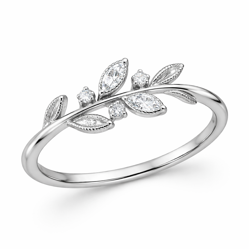 Make a silver foliage ring make it dainty, but not super small with four small diamonds two of the diamonds are oval the other 2 are circle