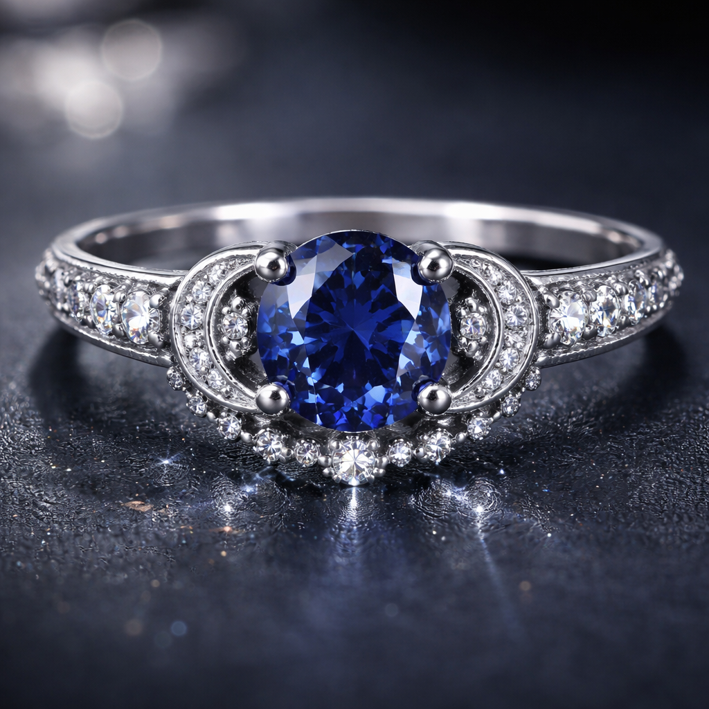 A classic women's ring made of silver with sapphire stones. anel com pedra central redonda e duas luas do lado. pedras transparentes em cima e embaixo simulando estrelas, classic style