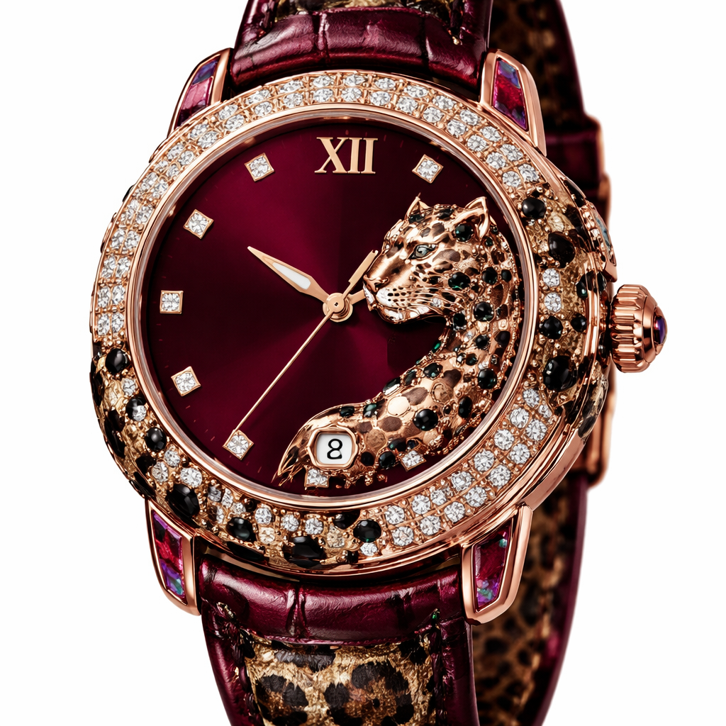 watch related to burgundy and leopard, luxury style