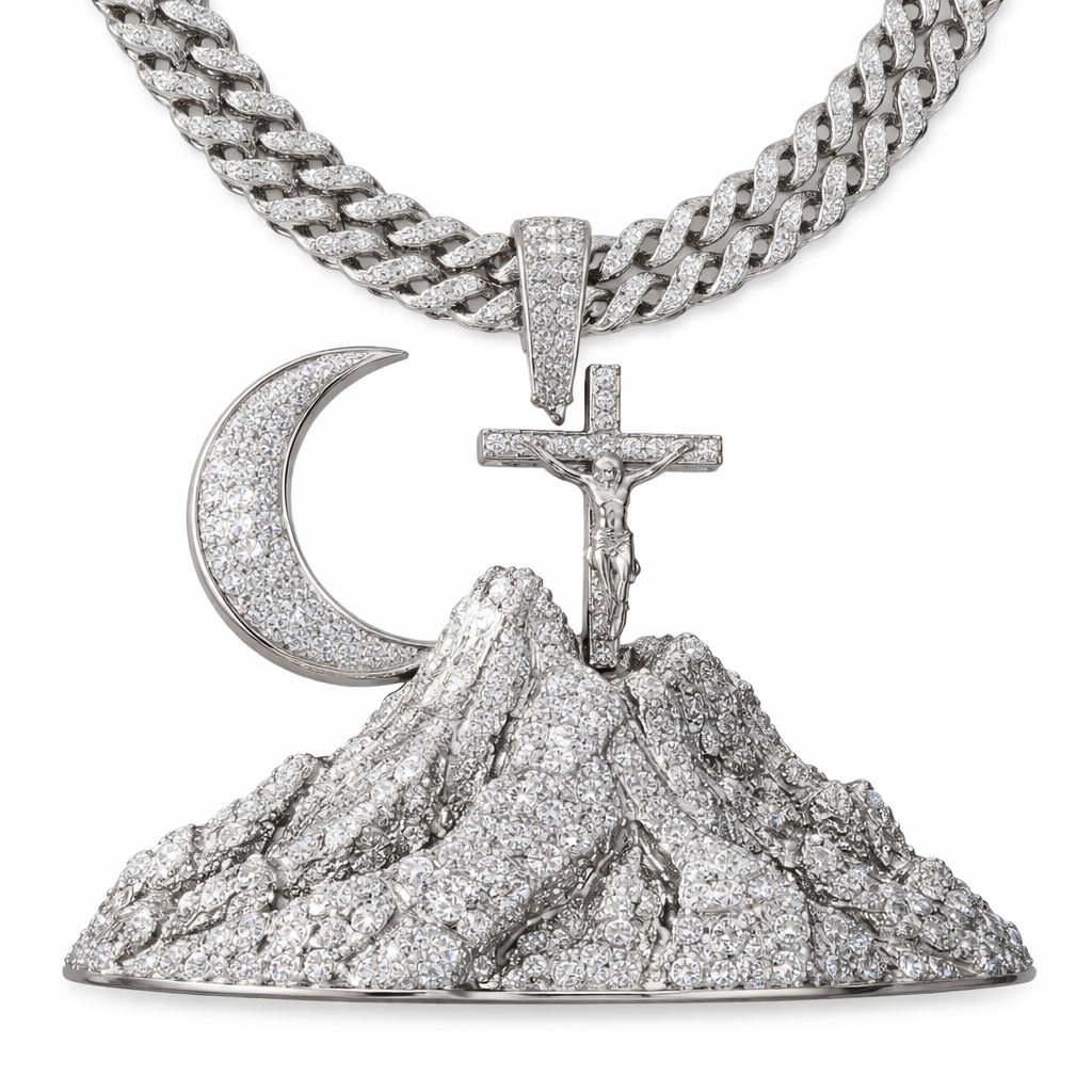 A nature men's necklace made of white gold with diamond stones. I want a diamond pendant 3D of Mt cristo rey with a diamond Cuban add da moon on the side of the crucifix no pine trees