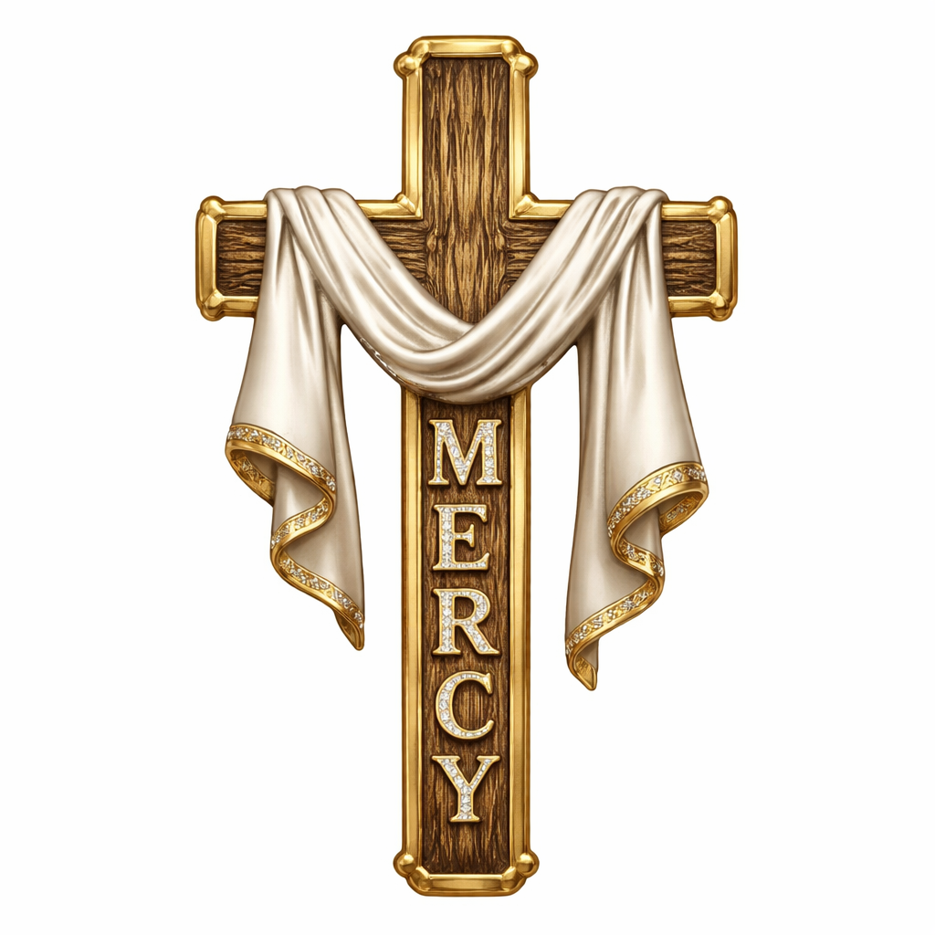 A gold wooden cross with a cloth draped over the crossbar shaped in the Letter M with the letters E R C Y below the drape of the cloth on the vertical part of the cross