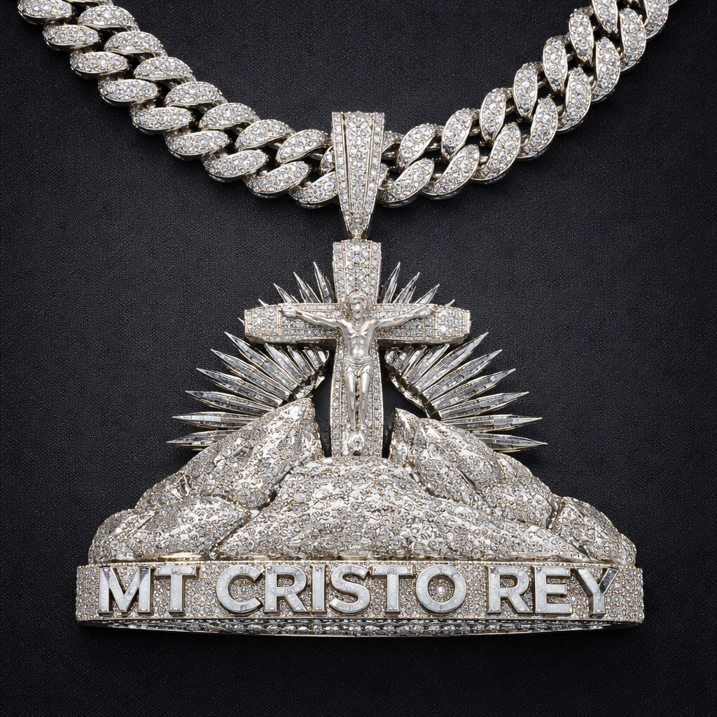 A men's necklace. I want to make the picture into a diamond pendant of Mt cristo rey 3D with a bust down Cuban link, modern style