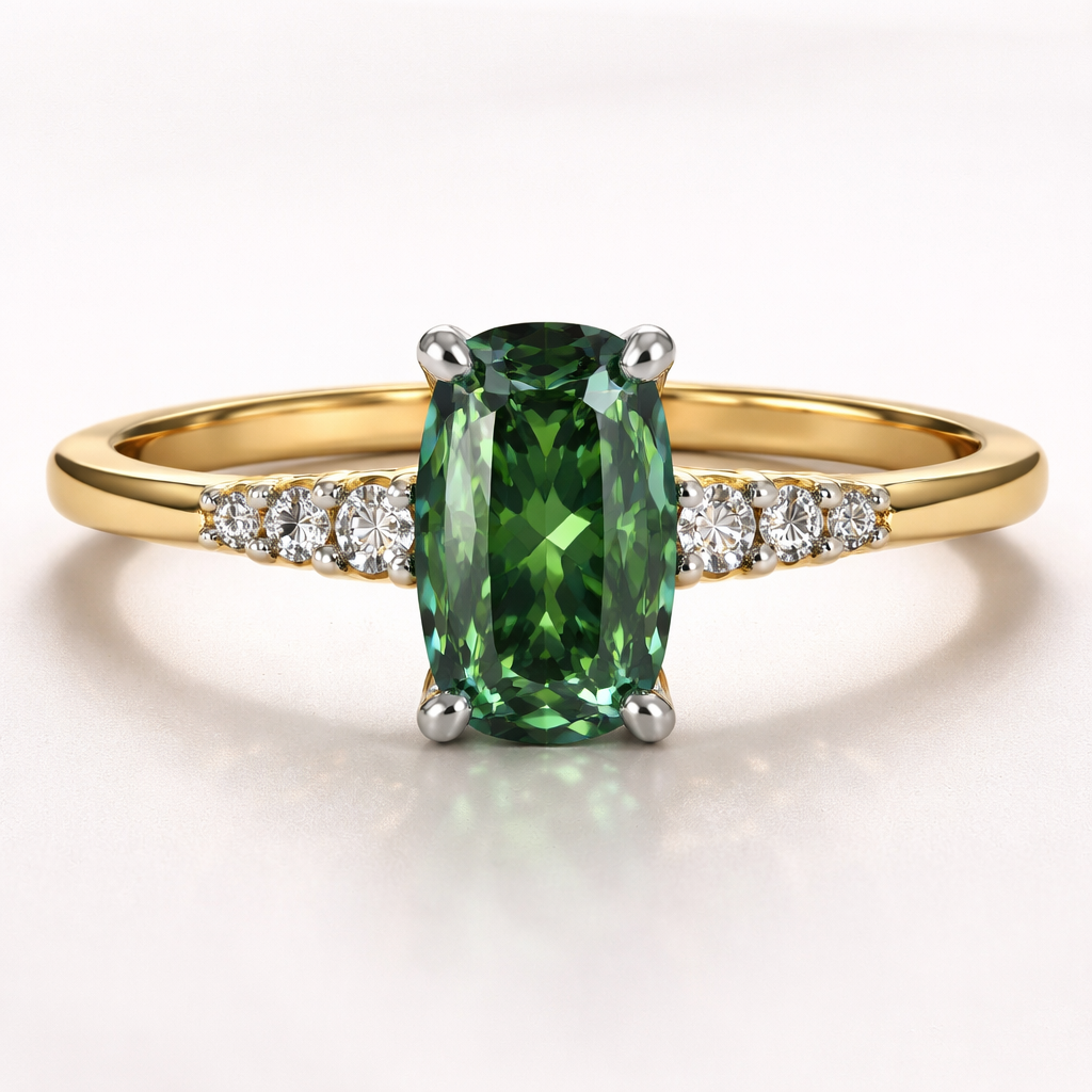 A yellow gold 18 carat thin band with a sharp angled edge ring. Central green sapphire in an elongated cushion cut. Either side of the central sapphire are three very small diamonds on each side going down the ring. The profile of the stones are raised slightly to accommodate a wedding band underneath. All stones are held in place by platinum prongs.
