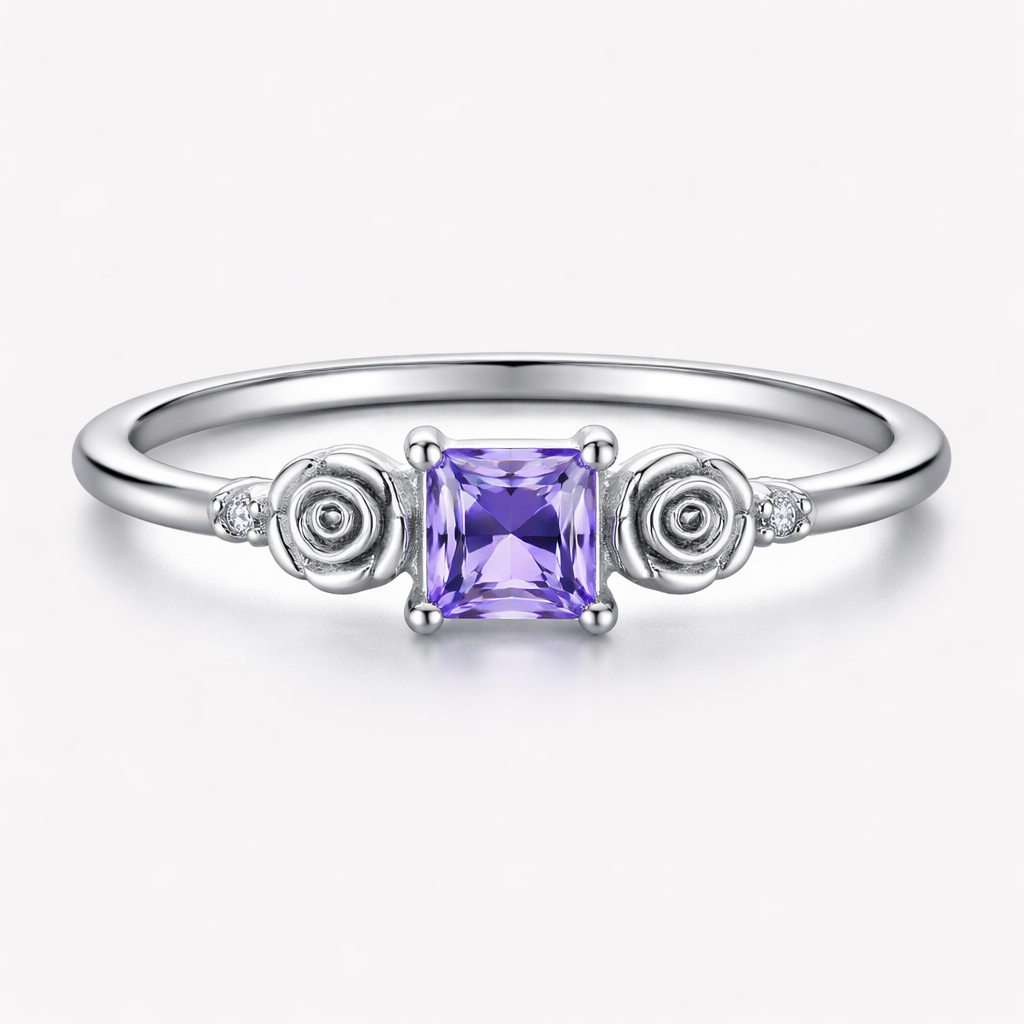A minimalist women's ring made of silver with amethyst and diamond stones suitable for daily wear. anel com uma pedra quadrada ao meio e com duas rosas ao lado. com pedrinhas ao lado das rosas, minimalist style