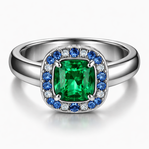 Stainless steel ring with a emerald and sapphires around it